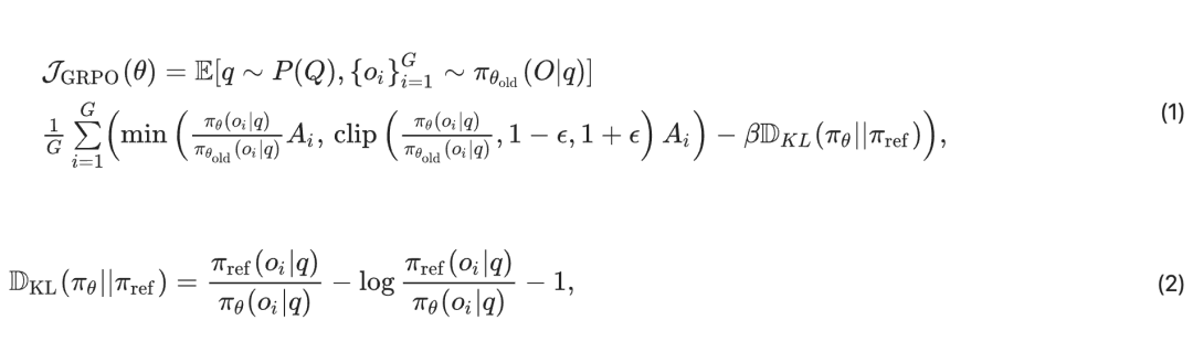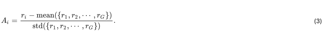 其中,(πref) 是参考策略,ϵ和 β 为超参数,Ai 是优势项(advantage),其通过每组对应于各个输出的奖励 r1, r2, …, rG) 计算得到:
