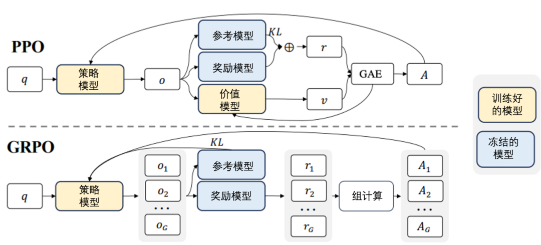 为了更好地理解GRPO,我们绘制了传统的PPO算法与GRPO算法的对比图: