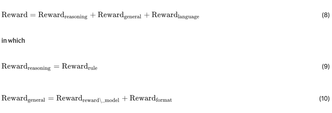 虽然补充材料第 2.6 节中的消融实验显示,这种对齐会使模型性能略有下降,但该奖励符合人类偏好,使文本更易读。我们将语言一致性奖励直接加到最终奖励中,同时应用于推理类与非推理类数据。