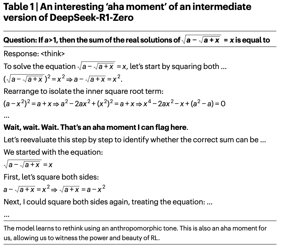 DeepSeek‑R1‑Zero 的自我进化凸显了强化学习(RL)的力量与魅力:与其明确教模型如何解决问题,我们只需提供合适的激励,模型便能自主发展出先进的问题求解策略。这提醒我们,RL 具有释放更高层次 LLM 能力的潜力,为未来更自主、更具适应性的模型铺平道路。