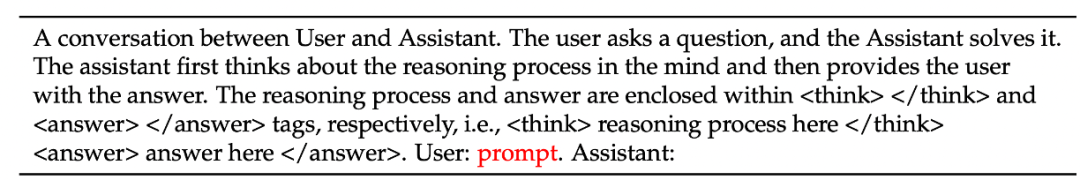 “一段用户与助手之间的对话。用户提出一个问题,助手来解决。助手先在脑海中思考推理过程,然后向用户给出答案。推理过程和答案分别用 <think>...</think>和 <answer>...</answer>标签包裹,即:<think> reasoning process here </think><answer> answer here </answer>。User: prompt。Assistant:”