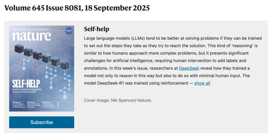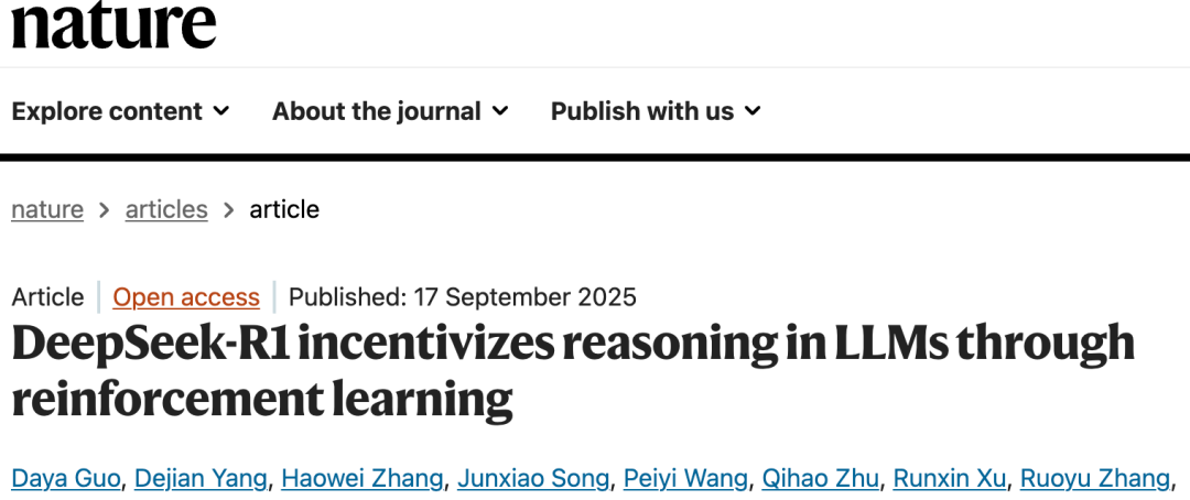 就在刚刚,一篇题目为:《DeepSeek-R1 通过强化学习激励大型语言模型进行推理》(DeepSeek-R1 incentivizes reasoning in LLMs through reinforcement learning)的文章登上了Nature,而且还是封面文章。