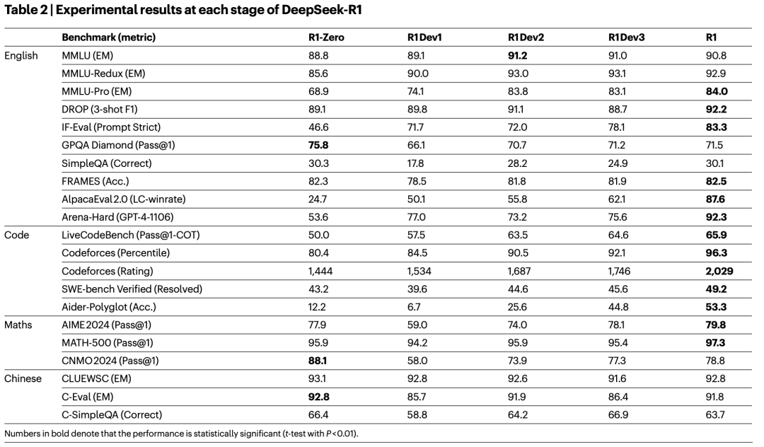 表 2 总结了 DeepSeek‑R1 在图 2 所示的多个开发阶段中的表现。将 DeepSeek‑R1‑Zero 与 DeepSeek‑R1 Dev1 比较,在指令跟随方面有显著提升,这在 IF‑Eval 和 Arena‑Hard 基准上的更高得分中得到体现。然而,由于冷启动数据集规模有限,Dev1 的推理性能相比 DeepSeek‑R1‑Zero 出现一定下降,最明显的是在 AIME 基准上。相比之下,DeepSeek‑R1 Dev2 在需要高级推理技能的基准上表现出显著提升,包括聚焦于代码生成、数学问题求解和 STEM 相关任务的基准。针对通用任务的基准(如 AlpacaEval 2.0)仅显示出较小的改进。这些结果表明,以推理为导向的 RL 在影响用户偏好导向基准有限的情况下,仍能显著增强推理能力。