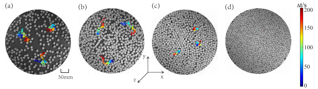 图5:由密度驱动的相变。 随着密度增加,系统经历了从无序到有序,再到“冻结”的过程,展现出四种不同的状态:(a)无序流动态、(b)集体旋转态、(c)部分固化态和(d)完全固态。