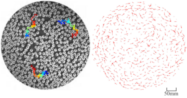 图4:集体运动的形成。 (左) 当密度达临界值时,粒子自发形成宏观漩涡。(右) 速度场图显示了整体顺时针旋转。
