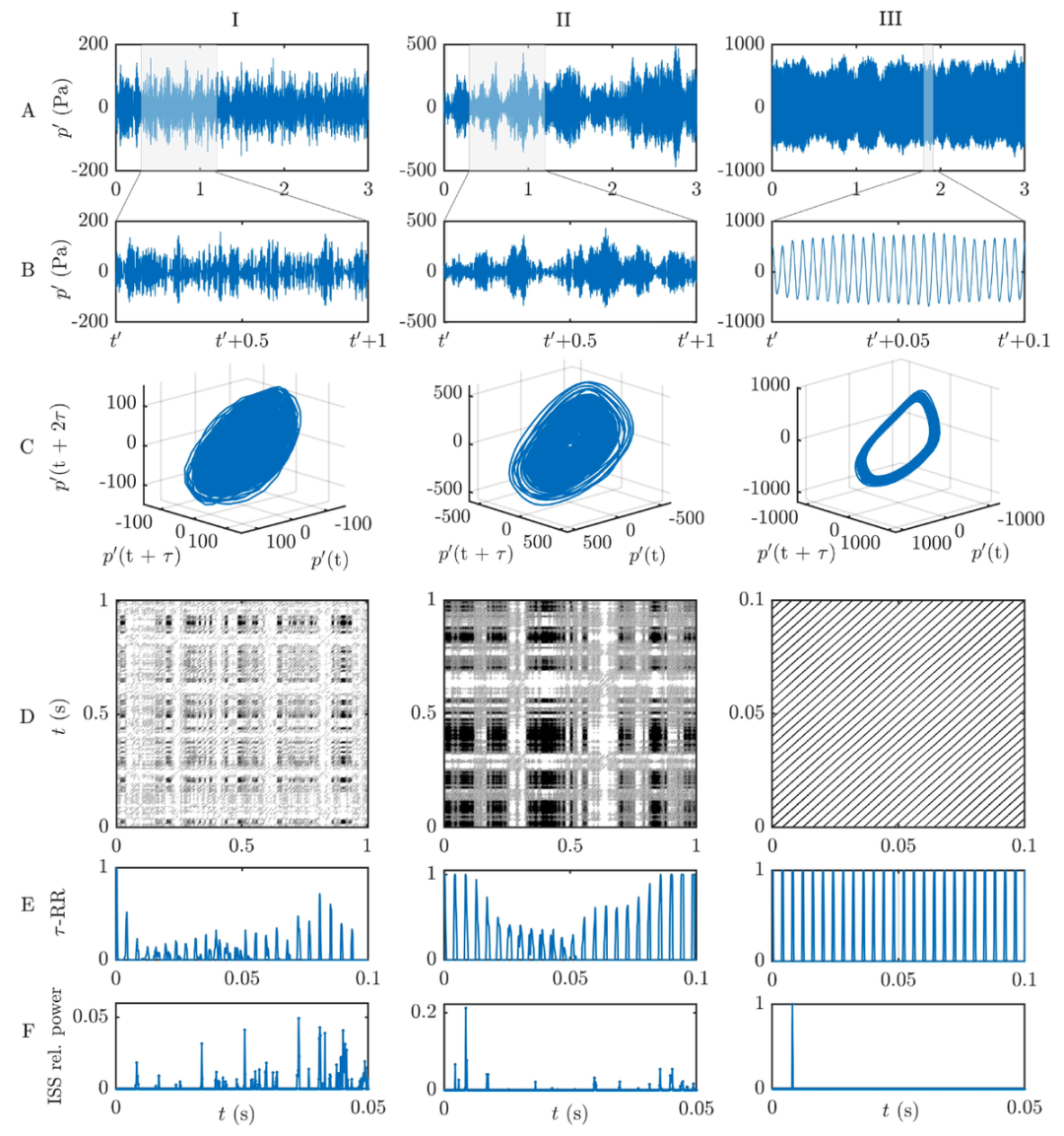 图 2. 利用τ -复发率和峰间光谱可视化循环凝聚。在燃烧噪声状态I-(a) (Re= 2.13 × 104时的混沌状态)、间歇状态II-(a) (Re= 2.88 × 104)和热声不稳定状态III-(a) (Re= 3.09 × 104时的LCO状态)下,滑塌体内的声压波动时间序列稳定了燃烧室。相应的相图说明了吸引子在这些体系(I-III)中的演变(C)。分别为1,1和0.1 s (B)的时间序列窗口构建RPs (D),使用对应于吸引子大小的20%的循环阈值。(I) – (III)(E)的τ-RR。(I) – (III)(F)图(I) – (III)(E)中所示τ- rrr的尖峰间谱。在燃烧噪声向振荡不稳定过渡的过程中,τ- rrs从宽分布转变为单一值,这在ISS中表现为从宽谱向优势模态的凝聚。