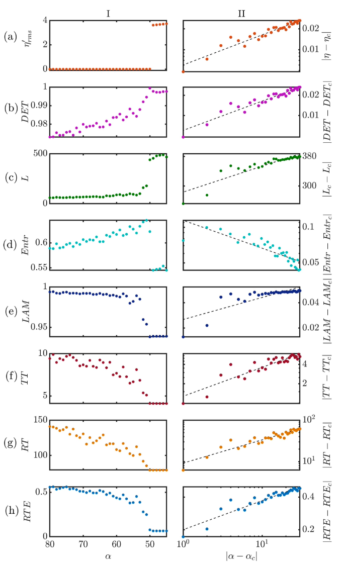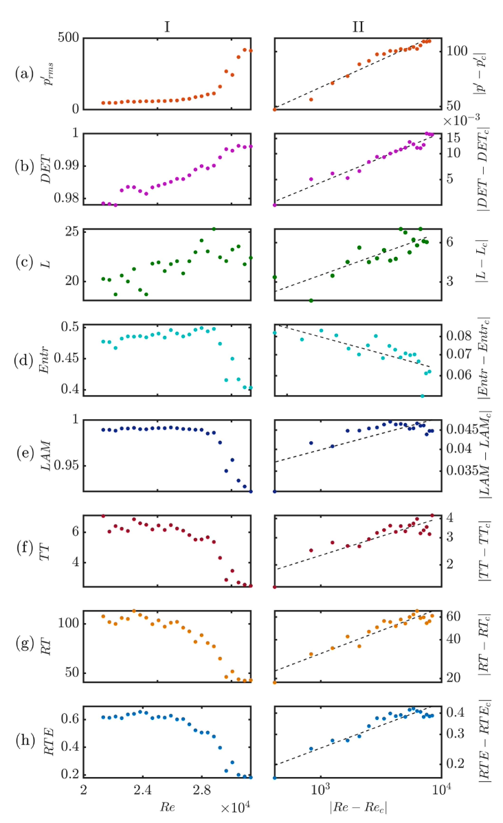 图 3. 临界点附近的 RQA 度量尺度缩放。p’ rms I(a)和循环测量I(b-h)随控制参数Re的变化。我们观察到,所有基于循环的测量都能提前预测到周期振荡的转变。控制参数(Re)的对应差值及其在临界点处的值(Rec = 2.96±0.069 × 104)之间存在幂律标度关系II(a-h)。在Rec有间歇性,它既有混沌性又有周期性。