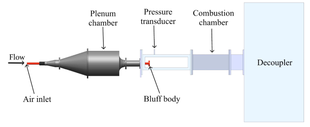 图 1. 本研究中所用的湍流燃烧室示意图。安装在燃烧室上的压力传感器测量声压波动。