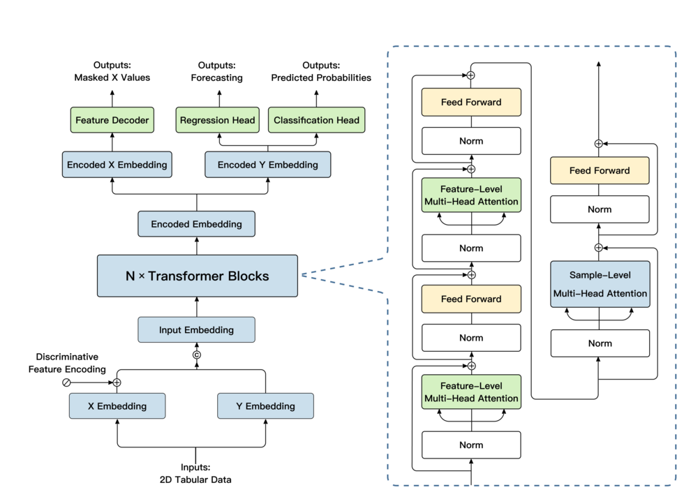 “极数”大模型沿用了transformer架构,并针对结构化数据建模和任务泛化进行了相关的优化。“极数”大模型先对先验知识库中的特征和目标分别进行embedding;之后在主要模块中,在样本和特征维度上分别使用注意力机制,来聚焦关键样本的关键特征。最终,提取到的高维特征被分别传入regression head和classification head,实现对不同功能的支持。