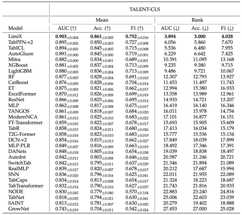 模型评测方面,选取了各个领域的权威数据集作为Benchmark。如开源数据集Talent,它包含上百个真实数据集,是当前领域内体量最大、最具代表性的基准之一。在分类任务中,对比“极数”与数十个领域内的常用baseline方法,“极数”大模型的模型性能显著超越其他模型,在AUC、ACC和F1 Score上均取得了最优。